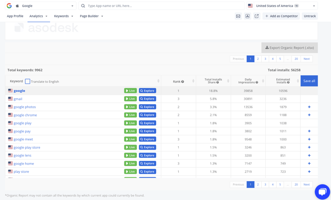 To access the Organic Report tool, go to ASO Tools and select Analytics → Organic Report from the top menu: