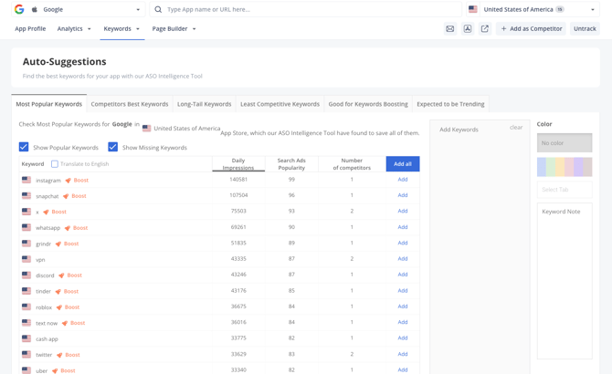In the Add Keywords tab, you can find keywords suggested by our algorithm for your application.