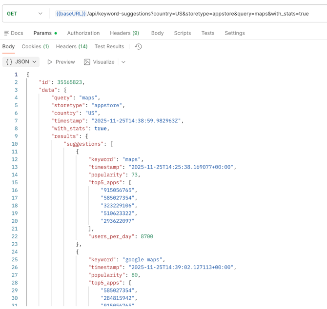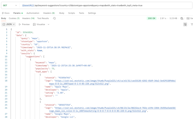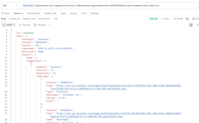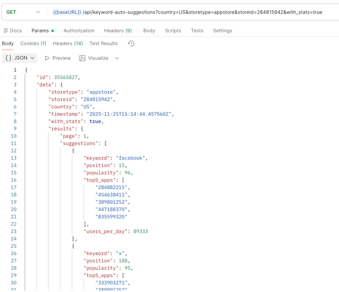 With additional parameter with_stats=true, the response will contain the data about each keyword suggestion (popularity, top-5 apps and Daily Impressions).