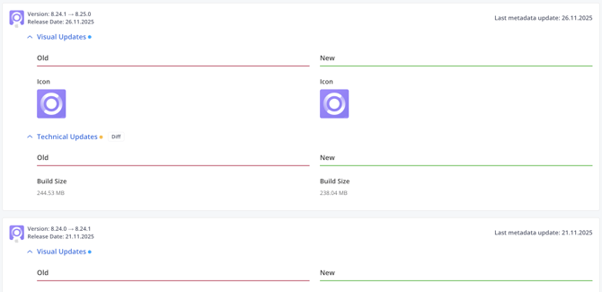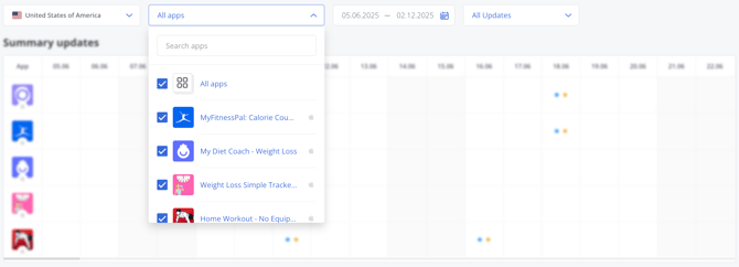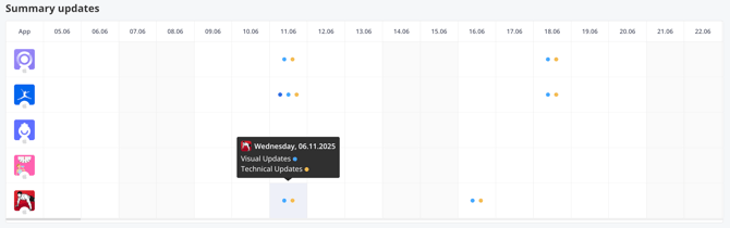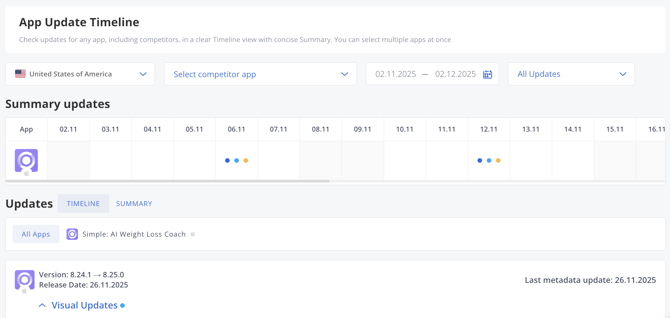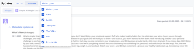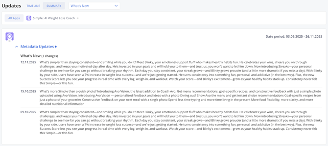 App Update Timeline allows you and your team to see at a glance when and what metadata (title, description, screenshots, icon, price, and more) has been updated, both in your own apps and those of your competitors.
