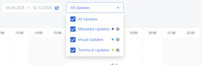 This section contains a table showing update groups for the selected time period. Each colored circle indicates the type of update: Metadata/Visual/Technical Updates.