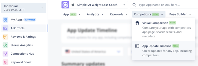 To access the tool, go to ASO Tools and select Competitors → App Update Timeline from the top menu: