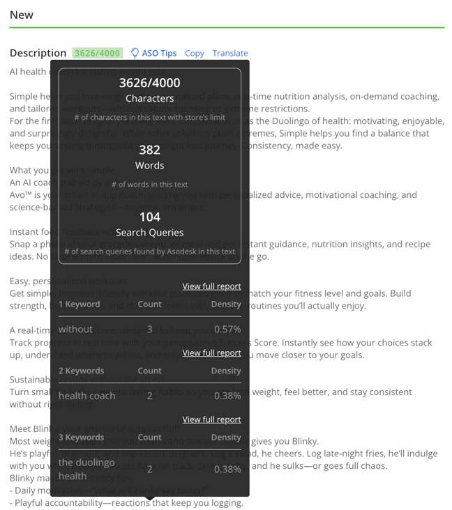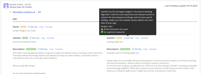ASO tips with rules and limits are available for text fields from the Metadata update group.
