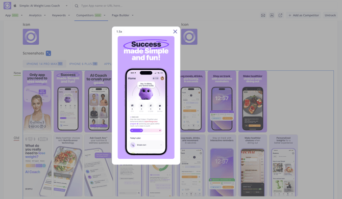 Icons and screenshots can be compared in full screen mode with individual zoom for each.