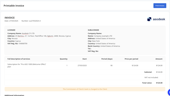 Click the "Print Invoice" button in the upper right corner to download or print your invoice. You will receive the document in PDF format.