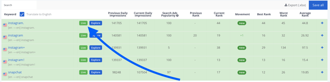 Click on "live" to see the current search results for a specific keyword. If you want to explore further, it will then take you to Search Explorer.
