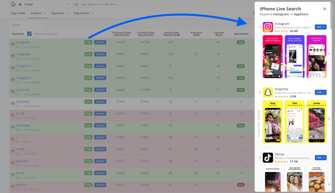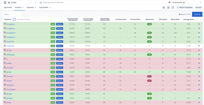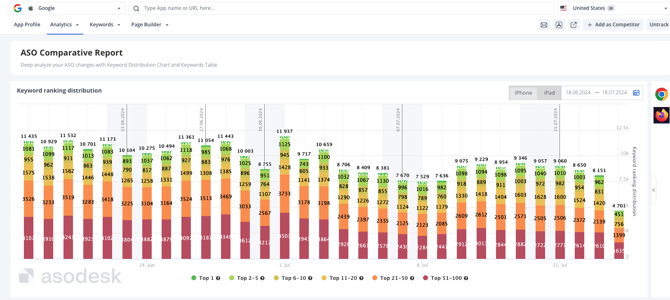 This feature provides a clear and illustrative view of how keywords are performing, allowing you to evaluate the effectiveness of your ASO specialist's work and determine if ASO optimization has been successful. It gives you a complete picture of how well your keywords are performing and how they have changed over time.