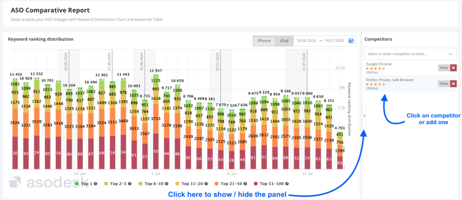 The first feature you'll see is the Keyword ranking distribution chart, which shows statistics on the daily ranking of keywords for your app in a selected country.