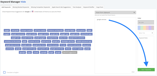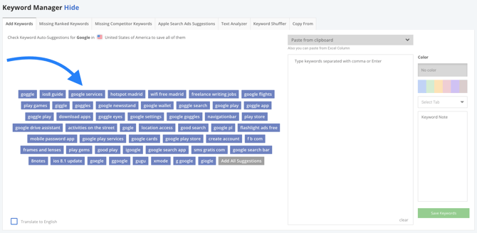 Simply click on a keyword to add it to the small window, the main area for working with keywords.