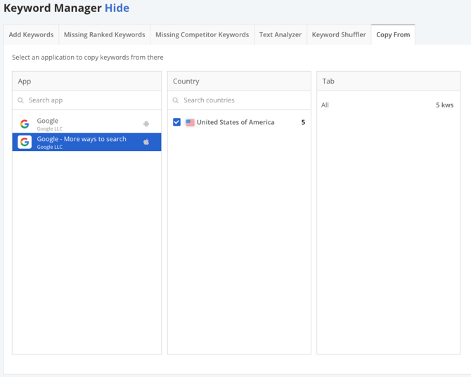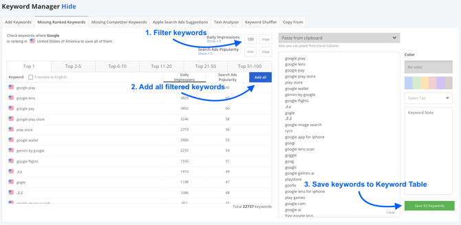 Here, you can select any app you are working with, choose the country, and easily transfer keywords from another app to analyze how they perform for this specific app. By simply copying and saving the keywords, they will be added to the Keyword Table for further analysis.