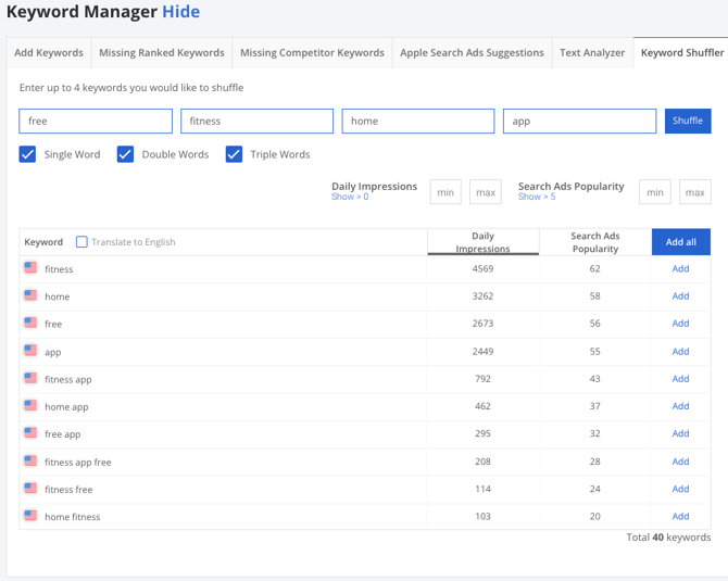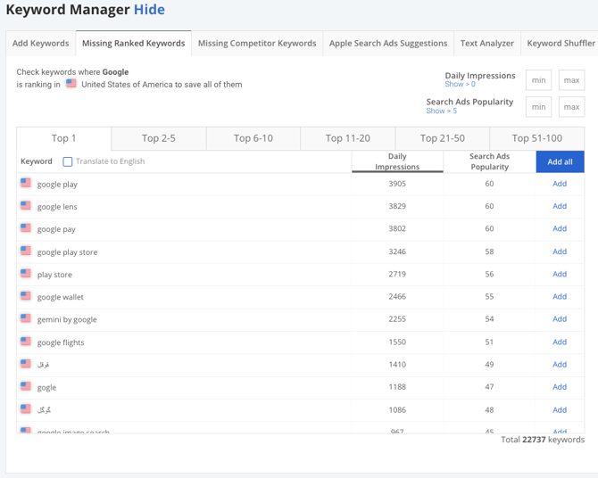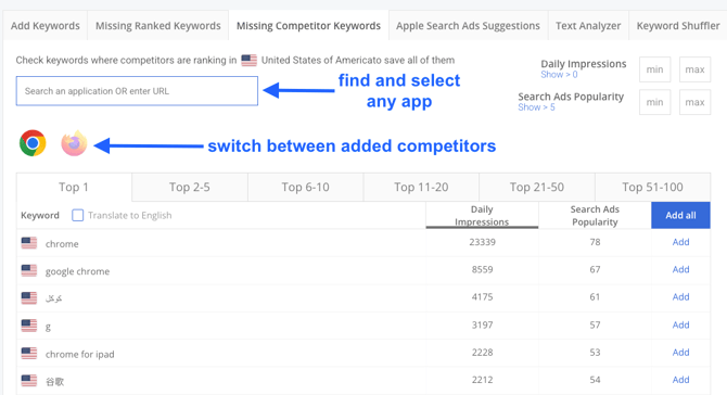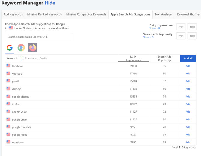 Additionally, you have the option to filter keywords based on Daily Impressions and Search Ads Popularity (App Store only).