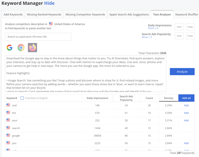 This feature allows you to analyze the full description of your app or even explore the descriptions of your competitors.