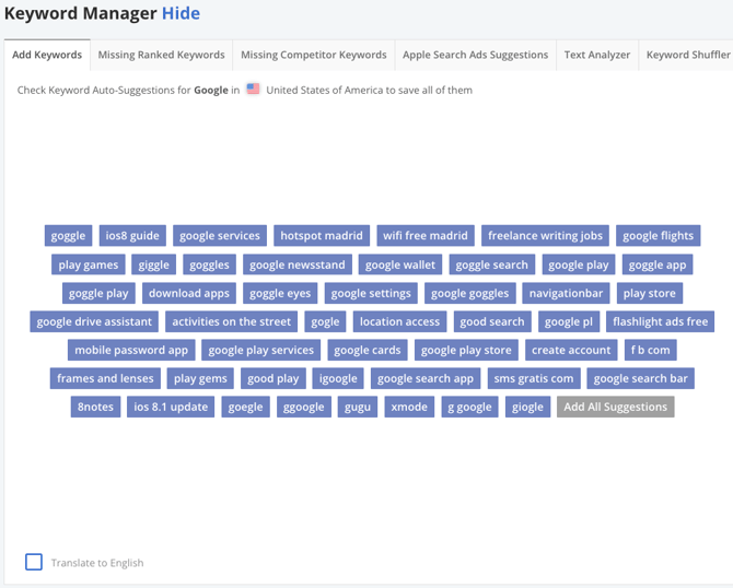 The first tab you will see is called Add Keywords, where you can find keyword suggestions generated by our algorithm based on your app's content. These keywords are relevant to your app and are commonly used by users when they search in app store.