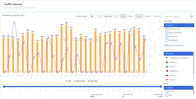 Integration with App Store Connect allows you to analyze real data about your app downloads and app page views, as well as gaining access to detailed Impressions, Product page views and App Units charts in Organic Report.