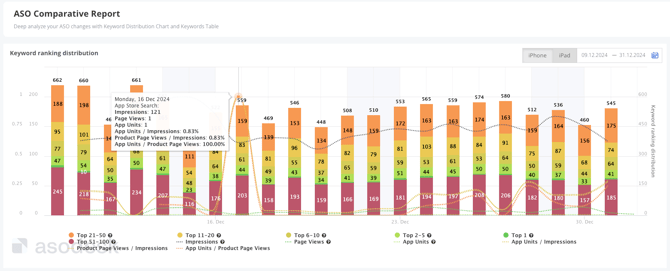 The Keyword Ranking Distribution chart will include additional data about Page views, Impressions, and App Units, as well as conversion rate. This enhanced data visualization provides a comprehensive view of how keywords are performing in terms of user engagement and app visibility.