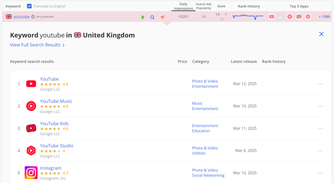The next button displays the top 20 applications for a keyword, along with information about the app's price, category, latest release and rank history. You can then view a full list of search results by switching to the Live Positions tool.