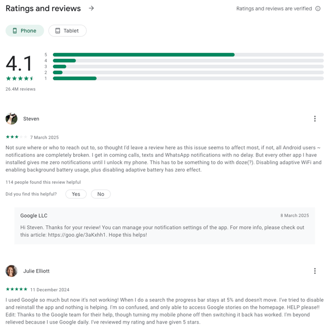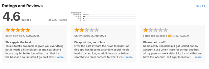 App stores don’t reveal the criteria for selecting featured reviews on an app’s page, and the update frequency varies widely. For major apps like Google, the same featured reviews can remain visible for years, while for newer apps, they may refresh daily. There’s no clear connection between factors like the total number of app ratings or how many likes a review gets that determines how often featured reviews change.