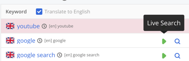 The Live Search button provides a real-time view of the search results for the selected keyword, simulating how it would appear within the app store.