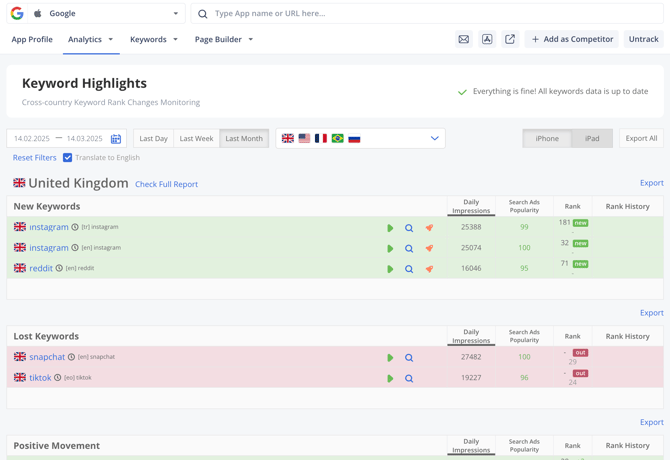 - Positive Movement - keywords for which your application is now ranking higher in search results;