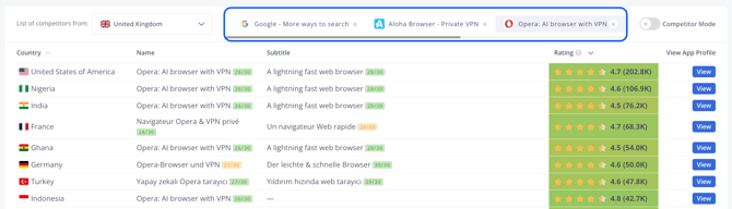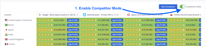 Enable Competitor Mode to compare your app’s performance with competitors you’ve added. This will help you assess your position and market reach in each country.