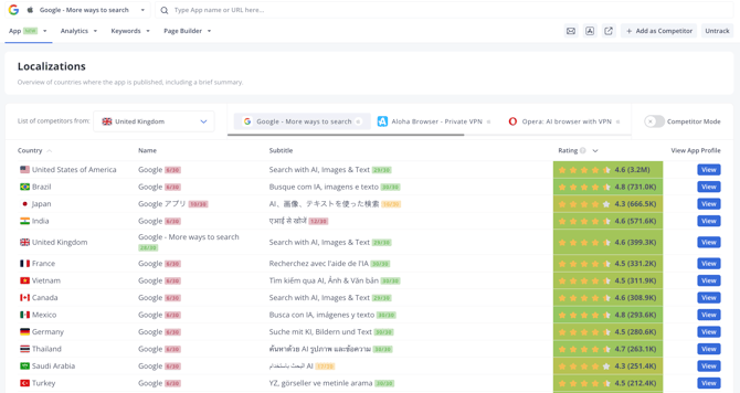Localizations is a powerful tool for analyzing your app’s performance across multiple countries and identifying growth opportunities in new markets. It simplifies competitive research by showing how other apps perform in different regions, helping you refine your strategy.