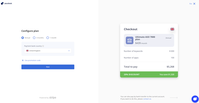 If you would like to pay by invoice or wire transfer, please contact your account manager or write to us at hello@asodesk.com.