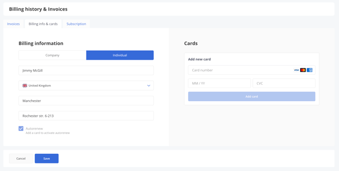 Select the Billing Info & Cards tab. Here you can view and edit your billing information and your card(s).