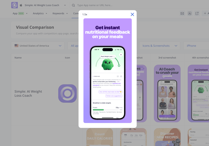 With Visual Comparison, you can compare app pages side by side. They are displayed exactly as they appear in the App Store, allowing you to evaluate icons, screenshots, feature graphics, and other creative assets in their natural context.