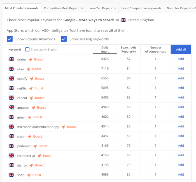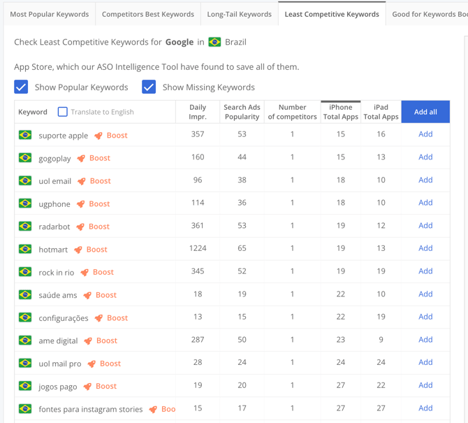На этапе, когда ваше приложение еще не настолько популярно, чтобы бороться за верхние позиции в самых популярных поисковых запросах, ваша задача - найти запросы, по которым конкуренция низкая. Мы уже нашли их для вас. В этом списке вы можете увидеть количество приложений и популярность по каждому запросу.