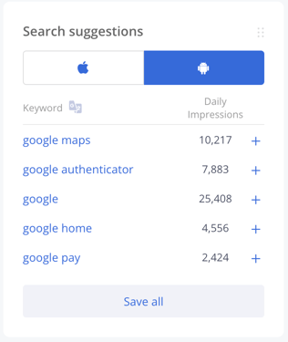 Вы можете добавить ключевое слово в таблицу ключевых слов в Find & Track, нажав на «+», или добавить все предложения сразу, нажав на «Save all».
